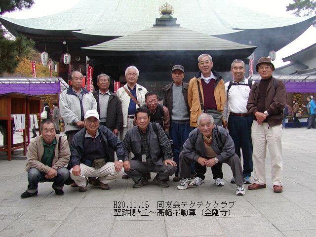 同友会会員の健康増進と、一層の親睦を図る目的で「三多摩の小さな旅」をテーマに、三多摩の公園、名所旧跡等を散策する「エクシオ同友会てくてくクラブ」が発足しました。 第1回は、聖蹟桜ヶ丘駅から多摩川沿いに散策して、紅葉の映える高幡不動尊(金剛寺)を参拝しました。 その後、境内の丘陵にある四国八十八ヶ所を約1時間をかけて巡拝し、クラブの結成を記念して、高幡不動駅駅近くの蕎麦屋で健康を祝し、再会を約束して冷たいビールで乾杯しました。 2008年11月15日