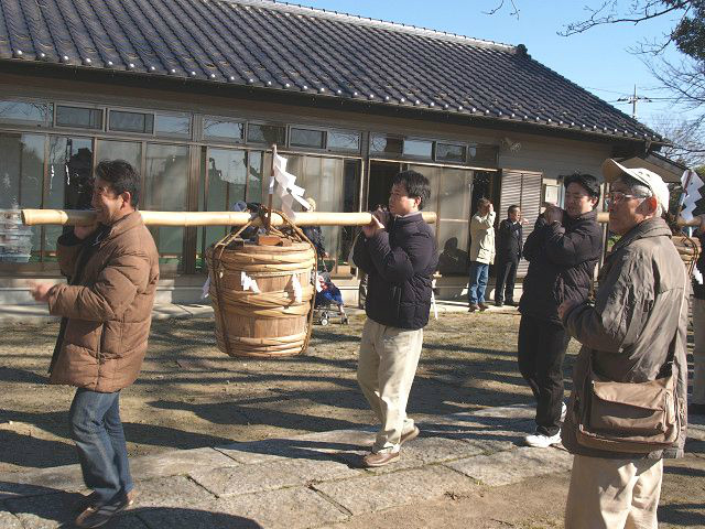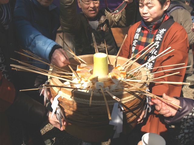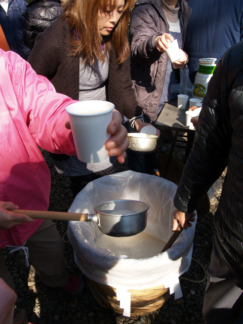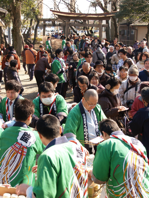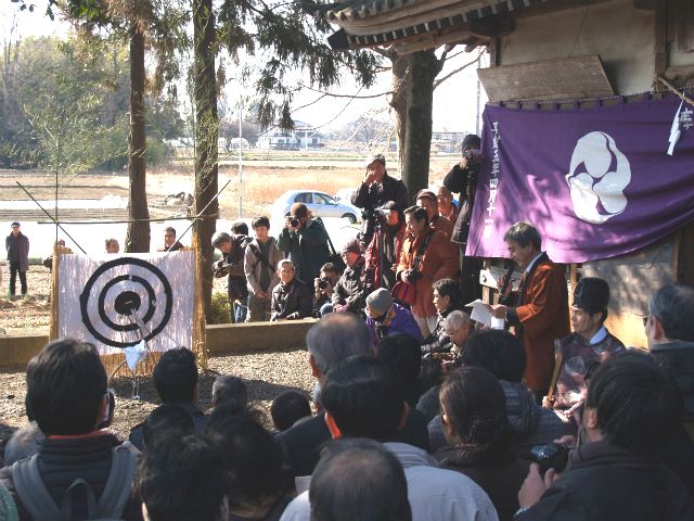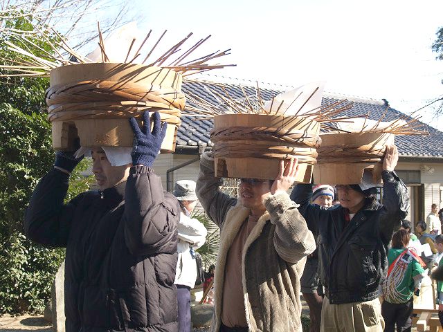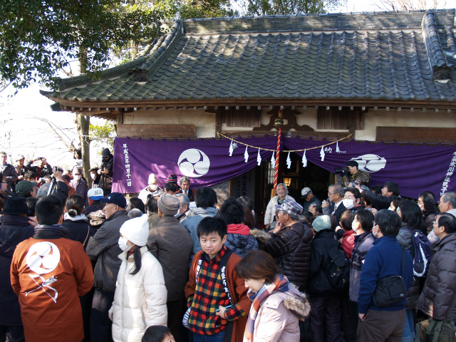 2月11日(月)には、毎年入間川沿いの老袋神社で県の民俗無形文化財に指定されている「老袋の弓取り式」の祭事が行われます。 境内に用意された的に春、夏、秋の3本の矢を射って、その年の天候を占い五穀豊穣を祈ります。 式の後には、甘酒と豆腐田楽が振舞われ、見物客の健康を祈ります。 自然に対する敬虔な祈りが、民に幸せをもたらすという伝統的な祭事として、普段は静かで小さな社に今日まで続いていることに感激しました。 2013年2月11日
