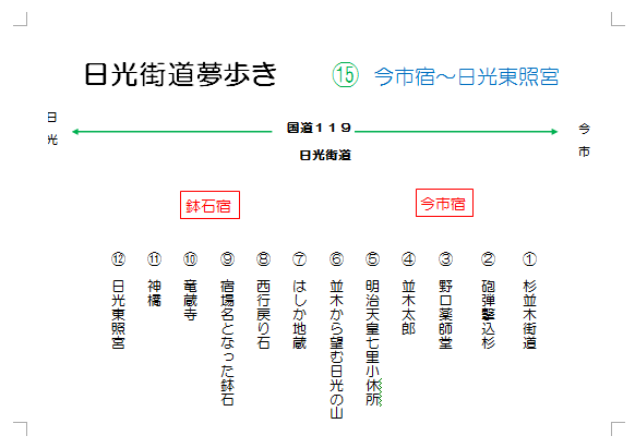 途中の国道4号線は歩いている人影は無く爆走する自動車街道でした。しかし宇都宮を過ぎて日光までの119線の並木街道は素晴らしい景観でした。時々土地の人に出会う位で歩きながら往時の旅人のことを想像しました。