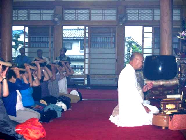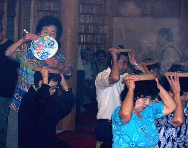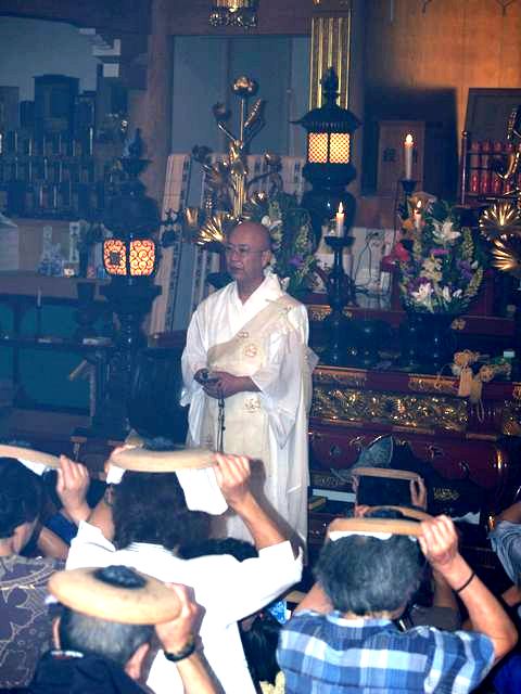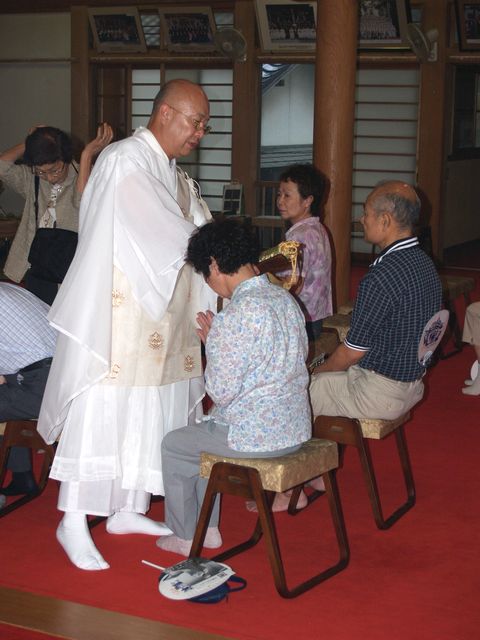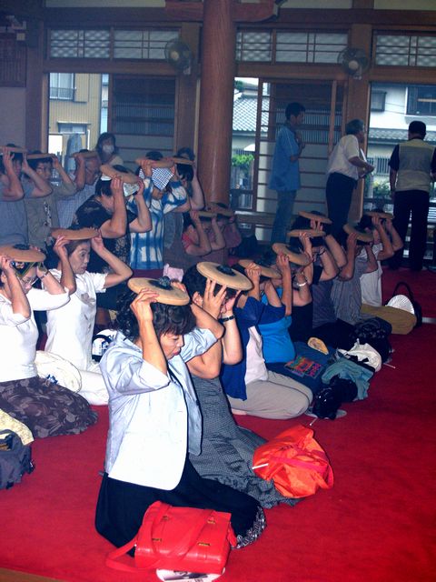 川越七福神の霊場である妙昌寺では、毎年、土用丑の日に伝統行事の一つとして恒例の「ほうろく灸」が行われます。昔、炎天下で暑さ負けした武将が、カブトの上から灸をすえたところ、たちどころに全快したと伝えられています。素焼きのほうろく皿を頭にのせ、大きなもぐさに火をつけてもらい「心頭滅却すれば・・・」と我慢すれば、暑気あたり、頭痛の病に効能あらたかなるものがあり、東京方面をはじめ近郷近在からの参詣で早朝から賑わいが続いています。 2007年8月 5日