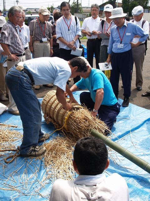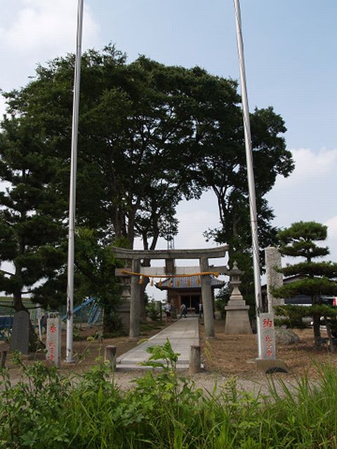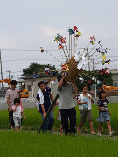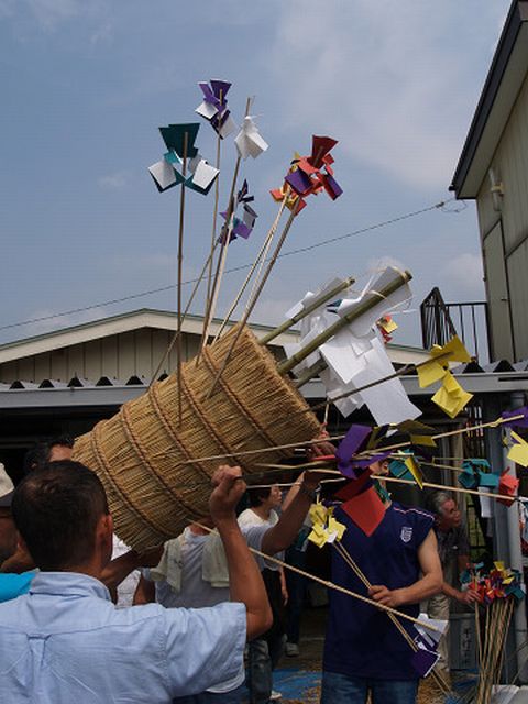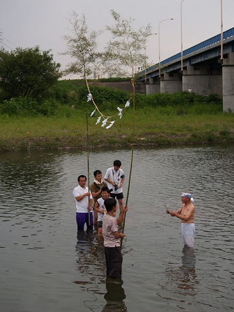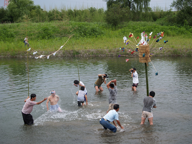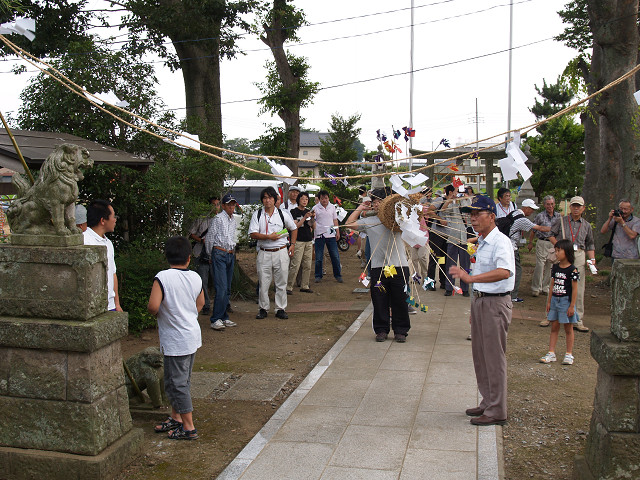 川越市の北西部、入間川の東側に位置する上寺山地区の八咫神社で、毎年7月の第2日曜日天王祭りの一つ「まんぐり」が行われます。青竹に麦わらを束ねて巻き、たくさんの幣束を挿したボンテンを担ぎ、行列を組んで村回りをした後入間川で禊をします。神輿の古い型をとどめた疫病除けの行事で、神仏に祈願するために水を浴び、体の穢れをとって清浄にする意味をもつまんごり万垢離が、訛ったものとも言われています。 2007年7月 8日
