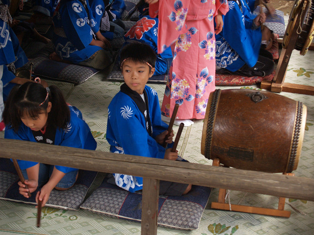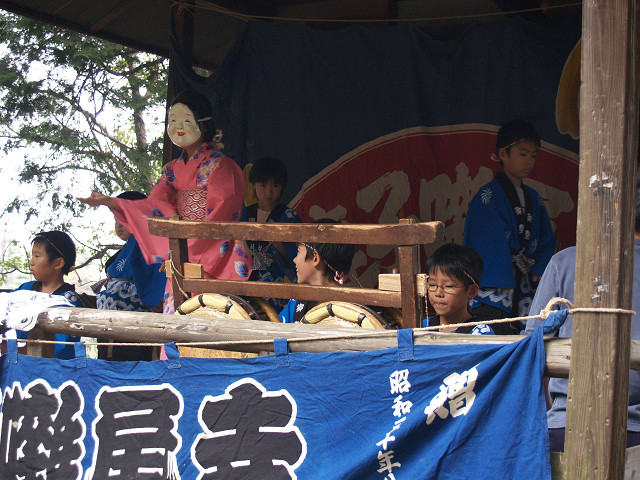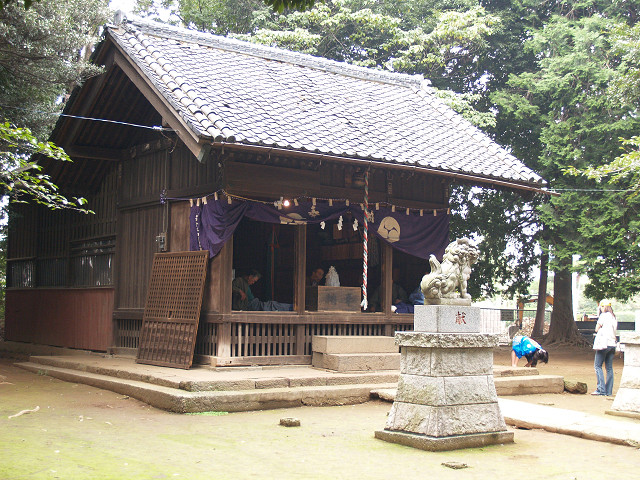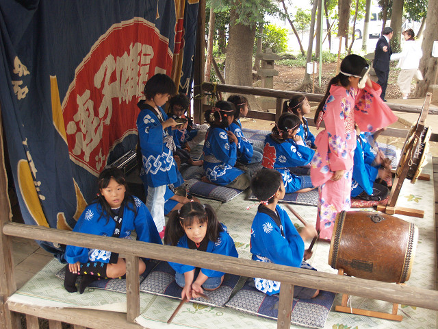 家の裏手にある小さな鎮守様の境内は、春は桜に覆われ、秋は銀杏の実を落とします。普段閑静なこの社も10月15日の秋祭りは、地元の子供囃子で賑わいます。笛・太鼓を覚えても中学に入ると止めていくとか、また年々指導者少なくなり、氏子の皆さんは寺尾で育まれた信仰の民俗芸能の伝承にご苦労されているようです。 2005年10月15日
